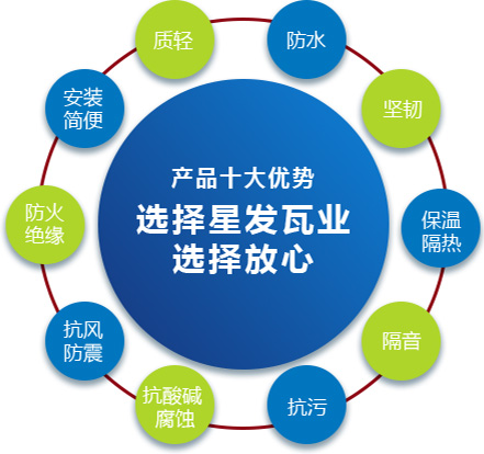 公司主要產品有《星發牌》合成樹脂瓦、APVC防腐耐候復合瓦、APVC發泡隔熱瓦、PVC半透明瓦、PVC防腐隔熱瓦、PVC防腐瓦、PVC防腐平板、PVC條紋板和ASA/PVC超耐候復合瓦等產品。產品一經推出,已被廣泛應用于國內各類平改坡項目和大型工業項目,遠銷歐洲、亞洲、美洲和非洲等國外市場,還獲選為廣州亞運會、深圳大運會、四川災后重建等工程項目的應用產品。公司在不斷創新和改革的基礎上,力求以更好的產品、優良的服務,用心、專心服務好每一個客戶。